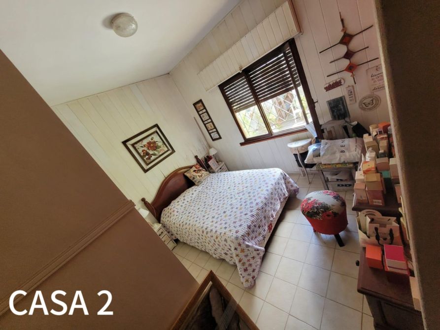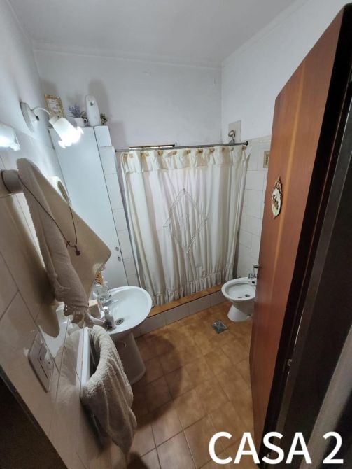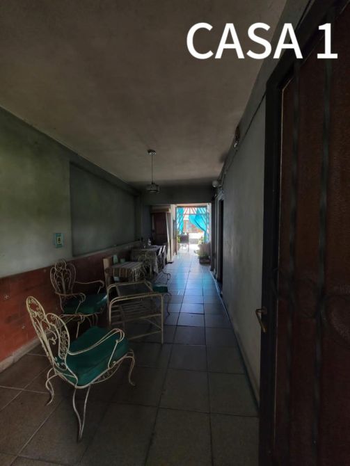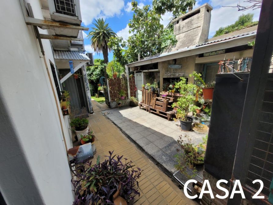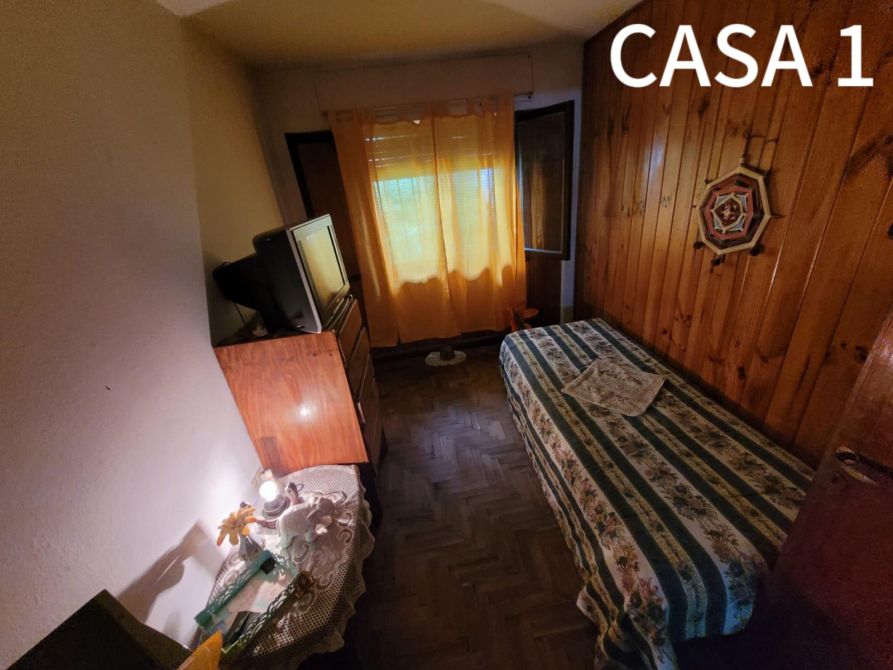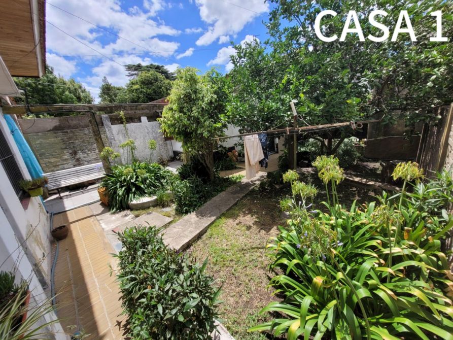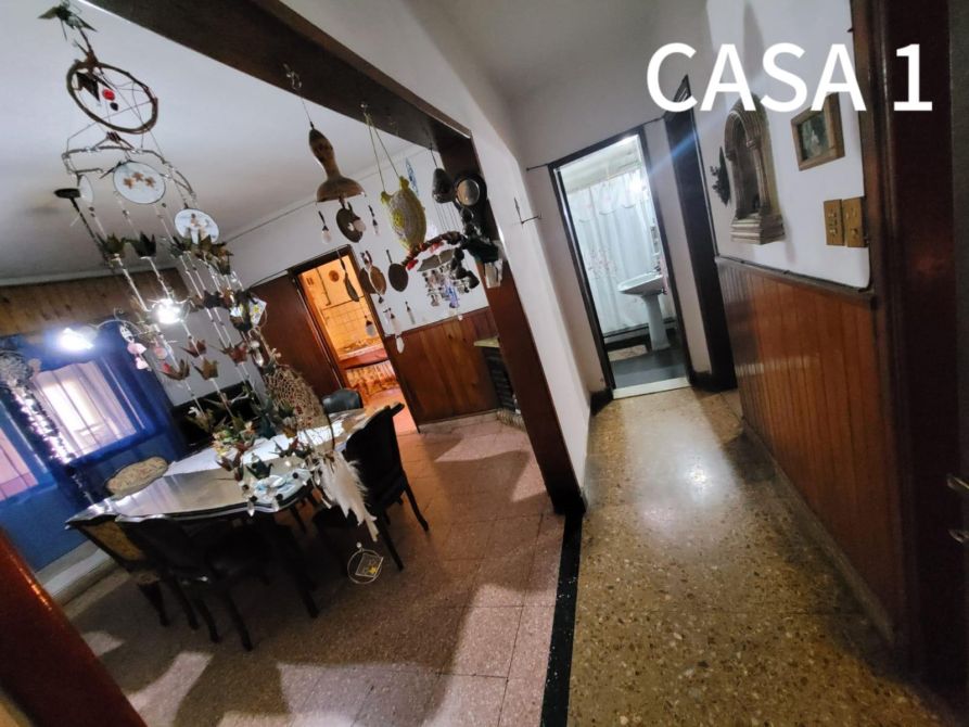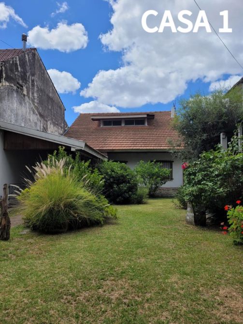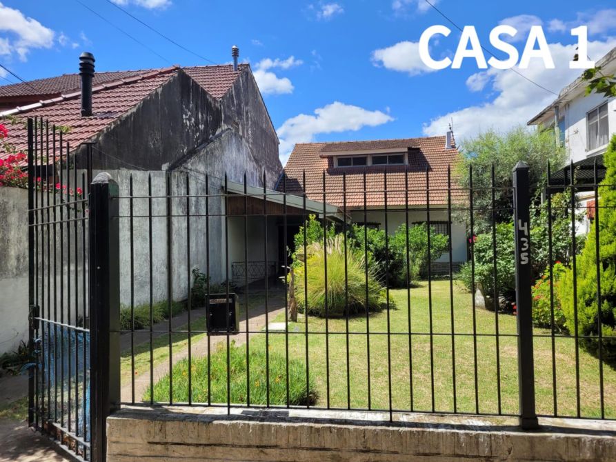 La casa del frente (1) está constituida en dos plantas. Al ingresar, se puede observar una cochera. Además posee, un comedor-cocina, living, baño completo y 2 dormitorios. Al salir, encontramos una galería y un quincho con un segundo comedor, un pequeño lavadero y patio.