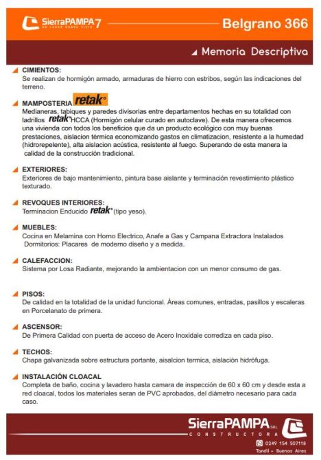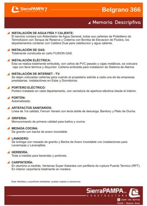 Construcción solida y termo acústica. Medianeras, paredes y tabiques en ladrillos. Ambientes cómodos, soleados y ventilados. Exteriores de bajo mantenimiento. Muebles de cocina y carpintería de calidad y a medida. Carpintería interior totalmente de madera. Revestimientos y pisos cerámicos de primera calidad. Baño completo. Grifería mono comando cromo. Instalaciones cloacales, agua, gas, tv, teléfono conforme a regulaciones.